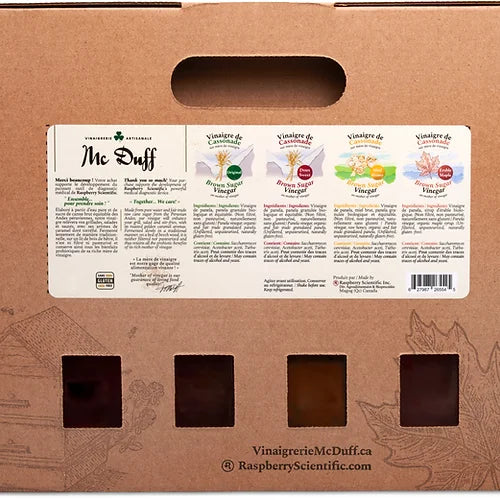 Try them and we bet your taste buds will want to put them everywhere. Made in the Eastern Townships from pure water and fair trade raw cane sugar from the Peruvian Andes, Mc Duff brown sugar vinegars enhance your grills, salads and stir-fries with their aromas of roasted golden caramel. Slowly fermented in the traditional way on a bed of beech wood, they are neither filtered nor pasteurized and thus retain all the probiotic benefits of their rich vinegar mothers.